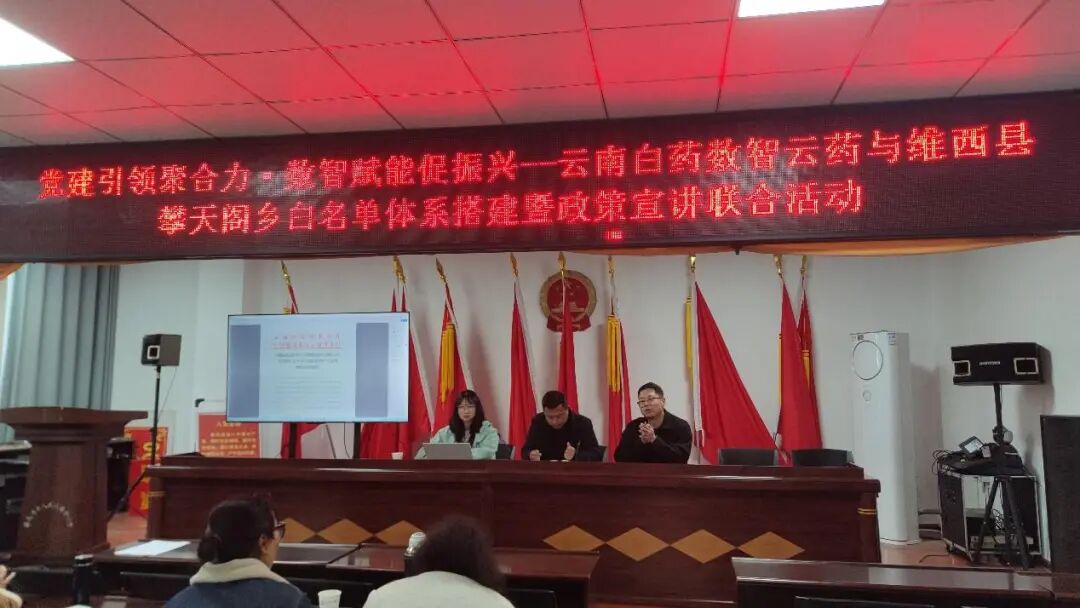 在县级政策宣讲会上,云南白药数智云药团队围绕《云南省中药材种植户白名单建设实施方案》,结合当地中药材产业发展实际,系统解读了“白名单”体系建设流程、申报标准及相关政策,现场解答申报与操作问题,破解资源底数不清、信息管理分散等产业问题,重点介绍了种植信息采集、数据审核备案和产业服务等方面的数字化解决方案。